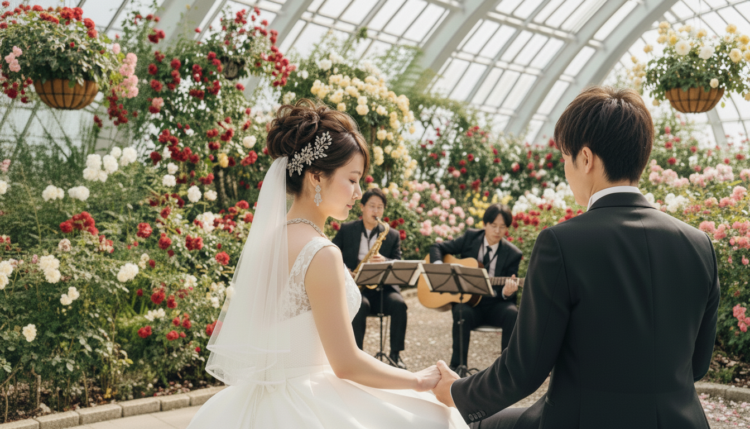 温室のプライベート空間で、ギターとサックスの柔らかな音色が花々と調和。陽光に包まれながら、ふたりの誓いを“音と映像”で記録します。
